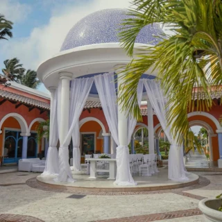 Iberostar Waves Dominicana offers personalized weddings with 10 stunning themes to choose from. Love bold, romantic colors? The Sunset & Spices theme blends deep burgundies and gold accents with the ocean’s brilliant blues. It features wooden chairs and woven chandeliers for an elegant touch. Prefer something more eco-friendly? Nature of Love theme keeps it natural with earthy tones, lush greenery, and simple details like minimalist arches and scalloped dinnerware. And for couples dreaming of a coastal-chic celebration, Tie the Knot-ical theme sets the scene with deep blue linens, sea glass chargers, and oyster shell décor.