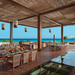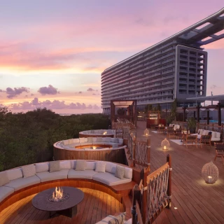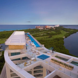 The resort offers an impressive array of amenities designed for a carefree and indulgent stay. Guests can enjoy three sparkling pools, including the longest rooftop infinity pool in Cancun, exclusive to Vantage Club guests. Wellness enthusiasts can take advantage of the state-of-the-art rooftop fitness center, open 24 hours, or join classes like yoga, boxing, and paddleboard yoga. The on-site spa provides a tranquil escape with rejuvenating treatments. Golf lovers will appreciate the nearby world-renowned course, while pet-friendly accommodations ensure no one gets left behind. With concierge services, room service, and easy access to the Ennea Beach Club, every need is catered to.